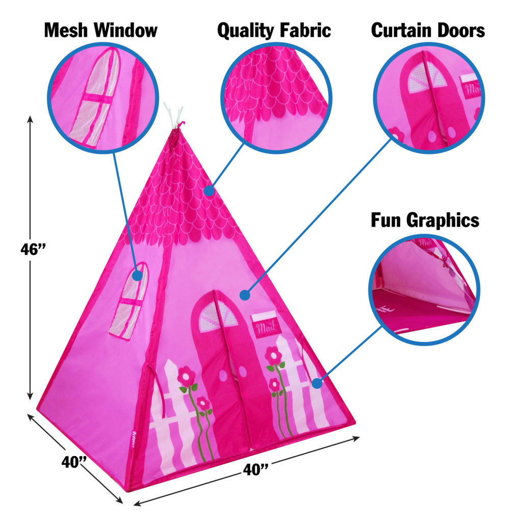 The tent is large enough for an intimate tea party, playing house or just hanging out for lounging, reading or play! It features colorful fabrics and decorative cottage graphics. The teepee entrance is graced with a set of curtain doors that can be tied back. There are two side windows to easily enjoy the view and they’re great for allowing in light and airflow! Set up is easy using sturdy plastic pole system. Includes a carrying case.