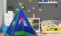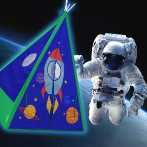 Let your child’s imagination blast off with this out-of-this-world teepee play tent. The tent is large enough for exploring the far reaches of the universe, playing astronaut and aliens, or just hanging out for lounging, reading or play! It features colorful fabrics and awesome space ship graphics. The teepee entrance is equipped with a set of curtain doors that can be tied back. There are two side windows to easily enjoy the view and they’re great for allowing in light and airflow! Set up is easy using sturdy plastic pole system. Includes a carrying case.