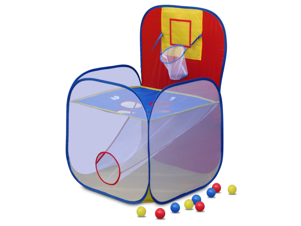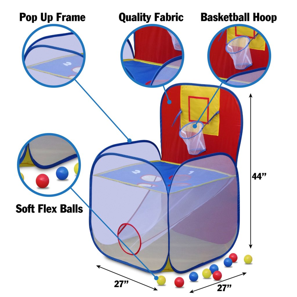 - There is a bottom area on the GigaTent Play Tent With Tossit Pop Up Game to catch the balls and a large hole to make retrieving the balls easy