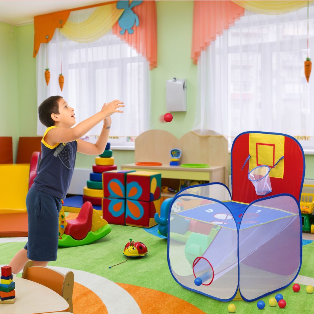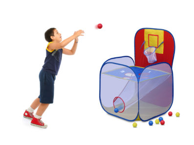 Just take this GigaTent Giga Kids Pop Up Play Tent out of the carry bag, open it and begin the fun. The 1-piece wireframe sets itself up instantly and is ready for action in seconds. This 2-person game consists of a basketball-style hoop and four holes with six colored balls. The holes are worth from one to four points each with the hoop worth an extra three points. The object of the GigaTent Play Tent With Tossit Pop Up Game is to get as many points as possible in a given number of tosses. Score big by throwing the ball through the hoop and get an extra three points added to the points from whichever hole the ball goes through. There is a large opening in the bottom of the Game Play Tent For Kids to make retrieving the balls easier. As a bonus, the bottom can be used for toy storage as well. The brightly colored balls are safe and non-toxic and are made of soft plastic to prevent injury.